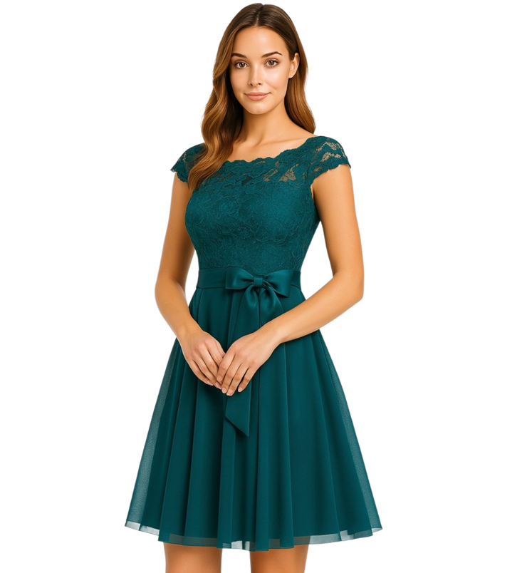 Rövid ujjú, A-vonalú felül csipkés csónaknyakú ruha