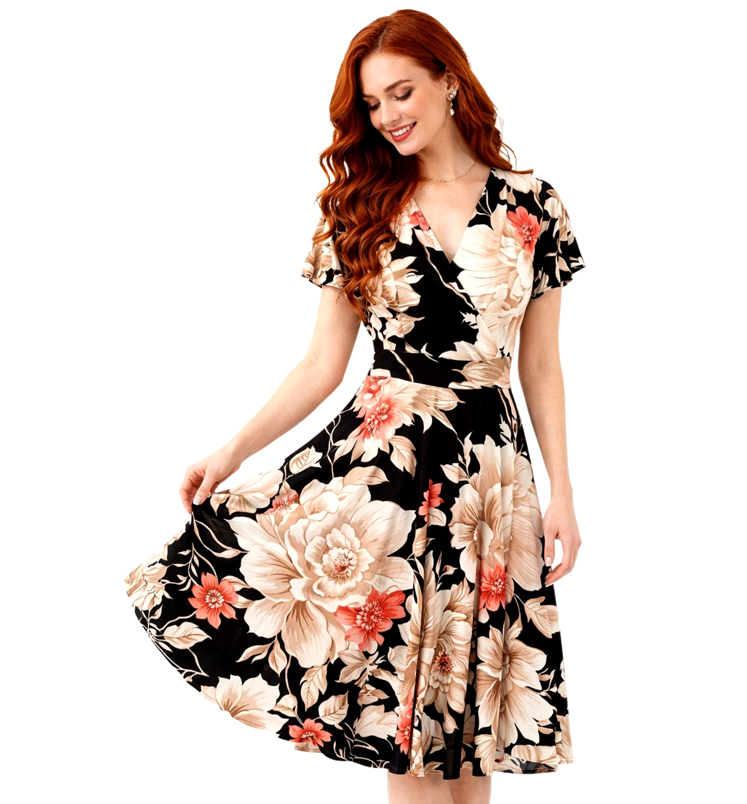 Mintás, rövid ujjú átlapolt, hátul gumis ruhakészletenszín: feketeminta: bézs virágok